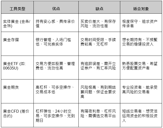 了解了黄金国际价格的基础后,接下来就是选择适合自己的投资工具。市面上有五花八门的管道,没有绝对的好坏,只有适不适合。下方的表格为你整理了最主流的五种方式,帮助你快速做出判断。