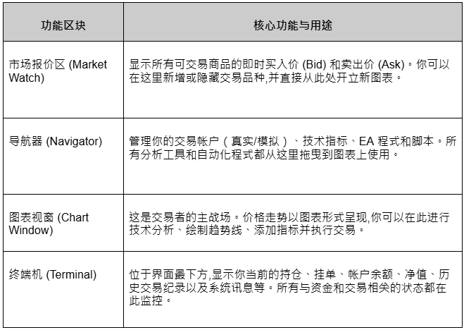成功登入 MT4 后,你会看到一个由多个视窗组成的界面。虽然看起来资讯量很大,但其实主要由四大核心区块构成,理解它们的功能是掌握 MT4 的关键。