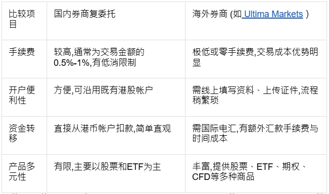 总体来说,若追求交易便利且不常交易,复委托是个选择。但若着眼于长期投资、频繁交易或希望降低成本,选择像 Ultima Markets 这样具备竞争力手续费和完善监管的海外券商,才能最大化你的投资效益。同时,确保所选平台提供可靠的Ultima Markets 安全保障与便捷的Ultima Markets 撤资流程也至关重要。