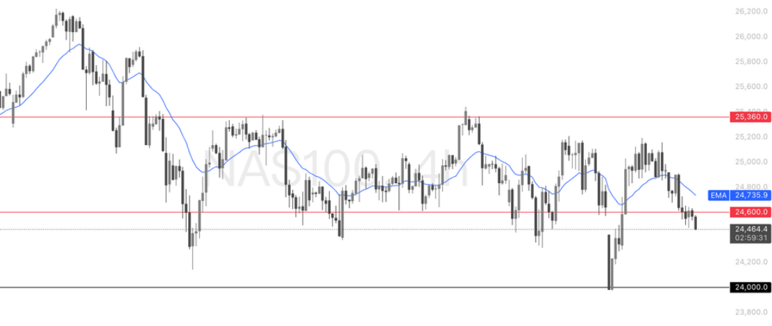 从图形结构看,当前 NAS100 4H 已明显跌破短期均线,价格运行在EMA下方,显示短线动能转弱。此前指数多次在 25,360 一线受阻形成区间顶部,而 24,600 为当前关键支撑位,价格已经开始测试该区域,一旦有效跌破,下方空间可能进一步打开至 24,000 附近的前低流动性区域。整体结构仍属于 25,360 – 24,600 的震荡区间,但重心正在下移。