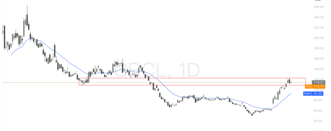 CRCL 日线级别已彻底终结前期下跌趋势,EMA 均线拐头向上形成明确的多头生命线,当前股价正测试 2025 年 9-11 月 100-120 美元的核心震荡箱体,回踩 90-100 美元区间是本轮多头趋势下低风险、高盈亏比的优质做多交易机会,该区间是四重支撑共振的强承接带,既覆盖了 100 美元整数关口与前期箱体下沿的压力转支撑位、92.5 美元附近的 EMA 多头趋势均线,也贴合本轮上涨行情的 0.382 黄金分割回撤位,同时是对前期箱体突破的有效性二次确认,回踩后的企稳有效性极强。