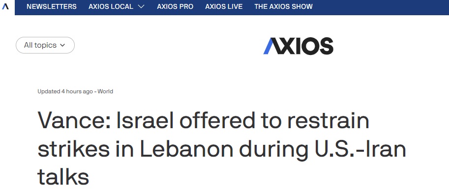 #伊朗危机追踪#FX168财经报社(亚太)讯 美国新闻网站Axios周三(4月8日)最新报道称,美国副总统万斯(J.D.Vance)周三表示,以色列已提议,只要美国和伊朗之间的谈判仍在进行,以色列就会在对黎巴嫩的空袭问题上保持克制。