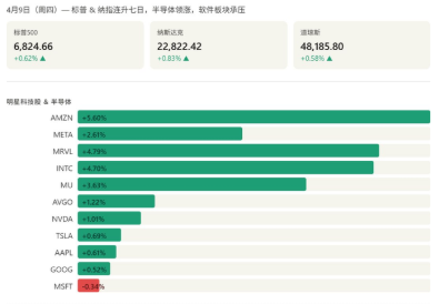4 月 9 日美股三大指数延续强势反弹,标普 500 与纳指七连涨,在地缘局势缓和、油价回落提振风险偏好的背景下,AI 及半导体板块成为核心主线持续领涨,叠加全球能源转型需求,后续市场关注半导体与储能两大方向,短期上涨后若出现波动,相关板块表现值得跟踪。