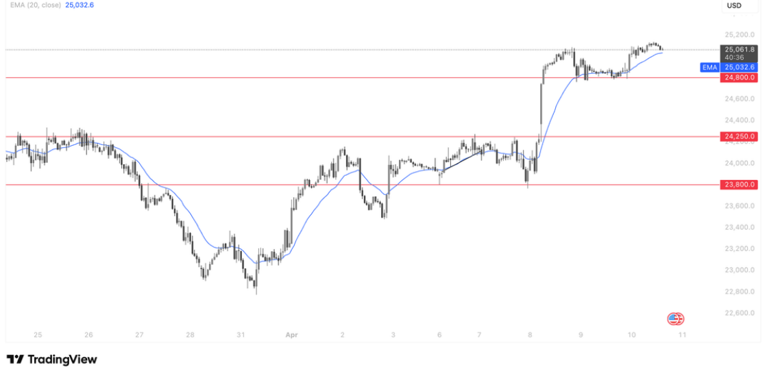纳斯达克 100 指数当前维持强势多头格局,价格依托 20 周期 EMA(25032.6)稳步上行,短期在 25061.8 附近震荡整固,24800 一线为关键支撑,若今晚 CPI 数据未出现极端超预期利空,指数或在均线附近运行,市场关注是否进一步上行,反之若通胀大幅超预期引发加息预期升温,市场将关注 24800 一带的支撑表现,整体趋势仍以多头主导,短线关注数据落地后的方向选择。
