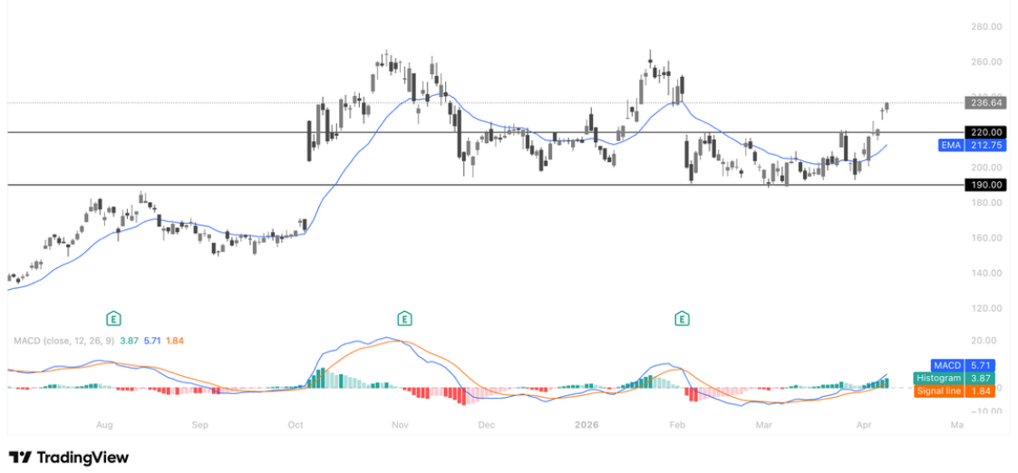 技术面上,股价已突破 190–220 美元箱体震荡区间,连续两日反弹,市场将关注 220 美元附近的价格表现。