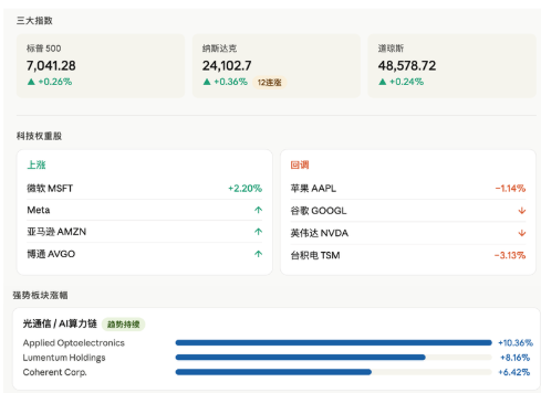 美股三大指数再创历史新高,纳指12连涨追平历史纪录,中东停火消息压低风险溢价是主要催化剂;锂矿与光通信两大板块领涨,货币基金单日历史级净流出预示场外资金加速入场,市场整体进入资金驱动的Risk-On初期阶段,但台积电"利好兑现"式回调、苹果英伟达高位整理,以及野村提示的能源与利率两大尾部风险,提醒当前强势行情下过热迹象同样不容忽视。
