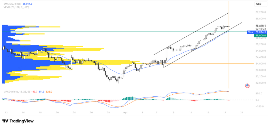 VIX 持续回落,持续维持在20美元下方,同时下穿 20 周期 EMA(21.69),均线拐头向下形成明确压力,当前价格已下探至 18 附近。恐慌指数的持续走弱,直接反映市场对美股波动的担忧大幅降温,避险需求显著消退,与纳指 100 的上行形成完美呼应。