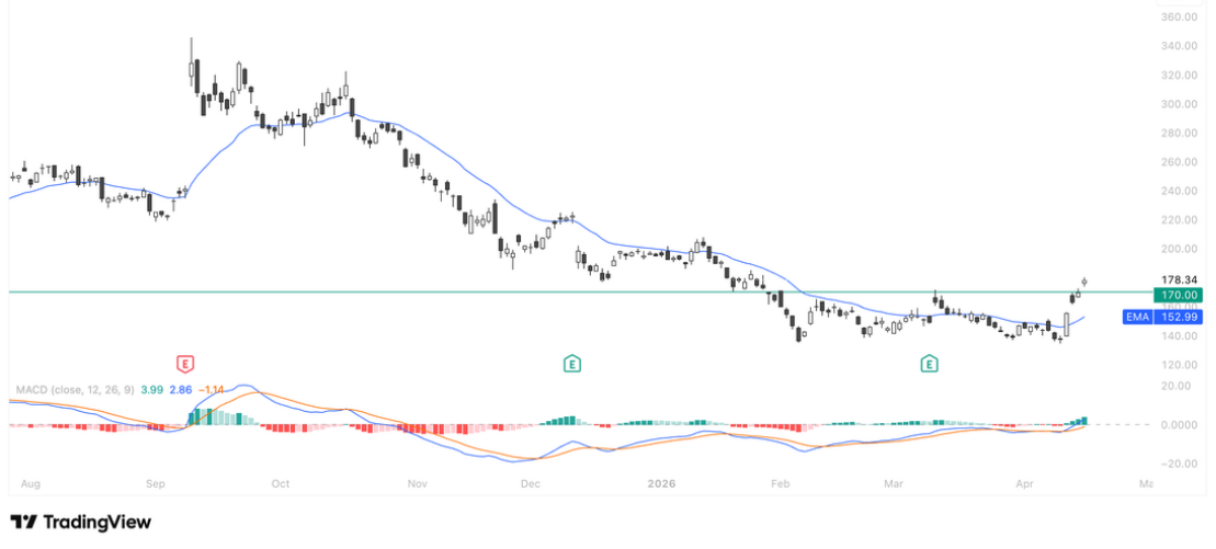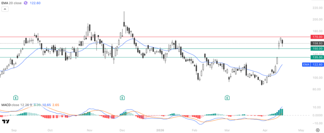 技术面来看,CRDO 自前期低点 80 美元附近开启 V 型反转,当前价格位于 158.93 美元附近,短期已突破 135-150 美元的关键阻力区间,站上 20 周期 EMA 均线(122.60 美元),均线拐头向上形成强支撑,目前在170美元附近受到获利盘了解回调,关注135-150区间的回踩机会。