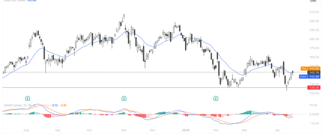 PLTR 当前价格约 142.76 美元,处于明显的下跌趋势中:价格多次反弹均未能突破 20 周期 EMA 均线(142.66 美元)的压制,当前 K 线再次回踩均线附近,关键支撑位位于 126美元一线,若无法守住该位置,下跌趋势将延续;上方阻力集中在 150 美元附近,只有放量突破并站稳该区间,才能确认趋势反转,或者等待回踩支撑企稳,建议等待更清晰的确认信号才能参与。