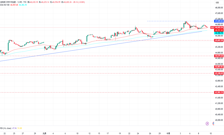 道琼指数受EMA50均线的支撑,保持在46400点水平上方盘整。上涨方面,道琼指数目前的阻力为10月3日高点47049点,再来是47500点水平。下跌方面,道琼指数接下来的支撑为10月6日低点46426点,接着为9月26日的低点75785点。