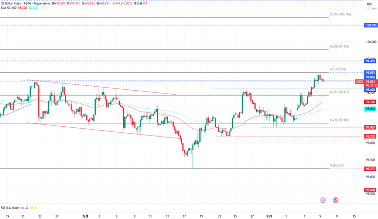 周三,衡量美元兑六种主要货币的美元指数上涨至98.872。由于美国联邦政府持续停摆且缺乏经济数据发布,市场焦点转向其他主要经济体的政治局势,反而在一定程度上使美元受益。美联储公布的9月联邦公开市场委员会(FOMC)会议纪要显示,多数官员认为今年仍有必要进一步降息,但对降息幅度意见分歧。市场普遍预期,美联储可能在10月28–29日的会议上再降息25个基点;然而,近期联邦政府停摆导致经济数据发布暂停,这将使得官员难以透过最新数据来调整政策立场。周四,市场将关注美联储主席以及理事鲍曼、巴尔的谈话内容。