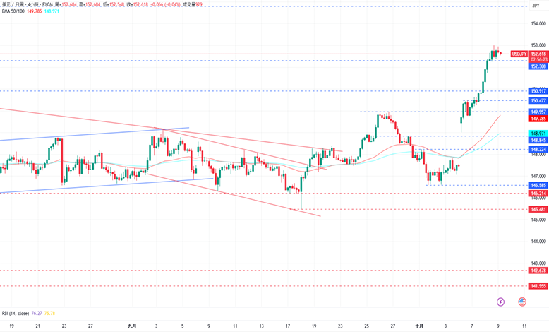CPT Markets分析师指出,美元/日元在突破了152.308的阻力水平后开始为持在上方盘整,并消化RSI指针的超买讯号。上涨方面,美元/日元目前的阻力是10月8日的高点152.999,再来是2月12的高点154.797。下跌方面,美元/日元初步的支撑为10月8日低点151.738,再来是10月7日的低点150.188。