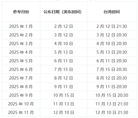 以下是2025年CPI公布时间表(美东时间上午8:30),台湾时间对应当晚8:30(或夏令时间9:30):