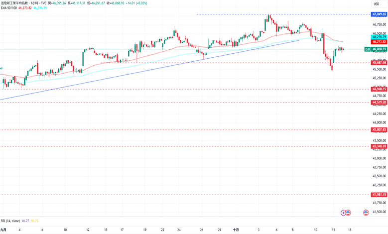道琼指数自45470点反弹后,保持在46000点附近盘整,以消化RSI指针的超卖讯号。上涨方面,道琼指数目前的阻力为10月10日高点46641点,再来是10月3日的高点47049点。下跌方面,道琼指数接下来的支撑为10月10日低点45470点,接着为10月2日的低点44948点。