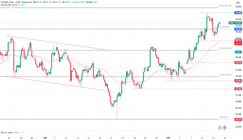 CPT Markets分析师指出,美元指数维持在99.608水平下方盘整,只要98.722的支撑水平未被突破,就仍有进一步上涨的可能。上涨方面,美元指数目前的阻力为10月9日的高点99.608,再来是8月1日的高点100.282水平。下跌方面,美元指数目前的支撑为10月8日的低点98.722,接着是10月6日的低点98.036。