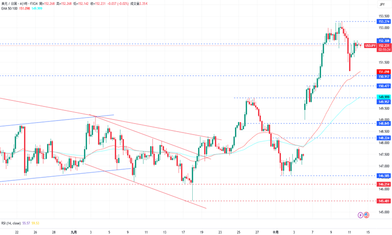 CPT Markets分析师指出,美元/日元在151.102水平建立更高的低点后保持在153.274水平下方盘整。上涨方面,美元/日元目前的阻力是10月10日的高点153.274,再来是2月12日的高点154.797。下跌方面,美元/日元初步的支撑为10月10日低点151.102,再来是由前一个高点的阻力转变成的149.957水平。
