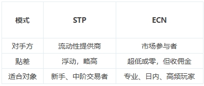 ● ECN:直接进入市场订单簿,超低点差、需付手续费,适合高频、专业玩家。