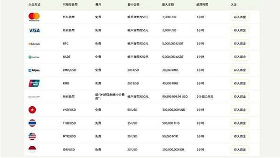 ● 提供多种美元出入金方式:电汇、电子货币包、加密货币、信用卡