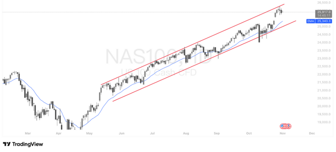 NAS100日线结构显示,自5月以来指数稳步运行于上升通道内,多头趋势明确。目前价格位于通道上缘附近,短线呈现高位整理迹象,显示多方动能略有放缓。若价格未能有效突破上轨,预计将回踩通道中线或EMA支撑区(约25,300一带)以蓄势。整体趋势仍偏多,只要价格稳守通道下沿支撑,后市仍有望维持高位震荡上行格局。