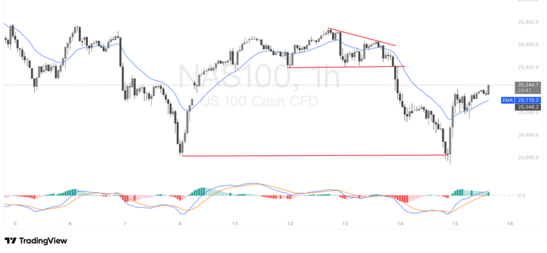 NAS100 在 24,600 一线获得明显买盘承接后快速企稳,小时级别形成强势 V 形反转显示多头力量正重新占据主动;价格也重新站上短均线,上攻结构逐步打开。只要维持在 25,100 上方稳固震荡,短线看涨逻辑成立,目标有望向 25,300–25,500 区间延伸。整体来看,破位后的快速修复强化了短线多头动能,反弹节奏或将持续延展。