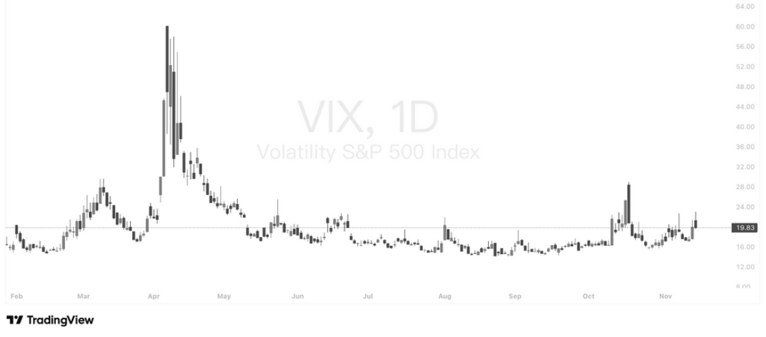 VIX 近期从低位持续震荡上扬,并多次向 20–22 区间发起测试,显示市场对短期风险的敏感度明显提升。尽管波动率尚未进入极端恐慌区,但其节奏性上行与美股技术性调整相呼应,反映机构在英伟达财报前主动抬升对冲需求。