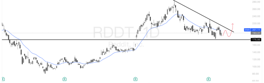 技术面来看,RDDT 在 175 美元强支撑上方企稳反弹,整体仍运行在大型下压趋势线下方,日线价格连续在支撑区形成长下影,显示空头力量正在减弱。当前走势可能进入“支撑稳定 → 震荡蓄力 → 挑战下降趋势线”的节奏,只要 175 美元不被跌破,短线仍有望向 205–215 美元区域尝试突破。若成功放量站上趋势线,结构将彻底扭转,并打开进一步反弹空间。