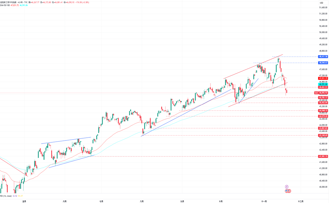 道琼指数跌破了上升通道的支撑水平,加剧了未来一段时间内跌势扩大的可能性,而目前RSI指标位于32,须注意进入超卖区域后价格短线反弹的风险。下跌方面,道琼指数目前的支撑为10月16日低点45781点,接着为10月14日低点45452点。上涨方面,道琼指数目前的阻力为EMA50所在的47031点,再来是48000点水平与11月12日的历史高点48431点。