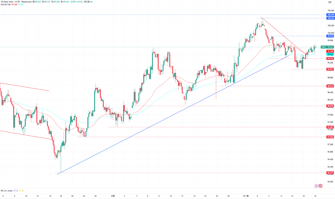 CPT Markets分析师指出,美元指数在突破了EMA50均线后保持在其上方交易。由于RSI指标维持在50上方,且未进入超买区域,代表仍有进一步上涨的空间。上涨方面,若能保持于EMA50均线上方,美元指数目前的阻力为11月7日的高点99.919,再来是11月5日的高点100.397。下跌方面,美元指数目前的支撑为11月14日的低点99.023,接着是10月28日的低点98.572。