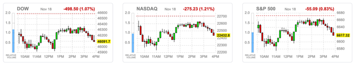 然而这种「循环式 AI 资本流」再次引发市场对科技巨头高估值的担忧,避险资金升温、VIX 飙升逾 10%,科技股快速回调。尽管盘中有买盘进场带动指数反弹,但科技压力仍主导大盘,最终纳指收跌 1.21%,费半大跌 2.31%。