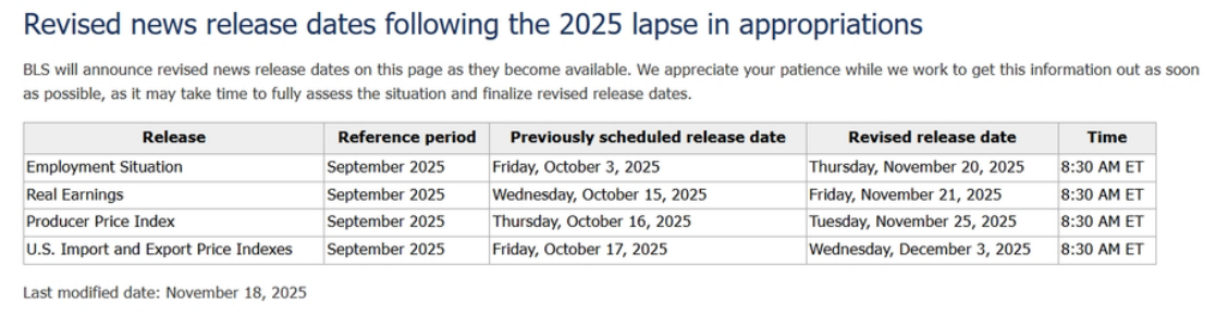 与此同时,美国政府停摆期间延迟的经济数据也已敲定发布时间。美国劳工部计划于当地时间周四前补齐所有缺失的周度初请失业金数据,部分数据将直接在官网更新而不发布新闻稿。根据最新公告,9月PPI将于11月25日21:30公布,9月进出口物价指数将于12月3日21:30发布。此外,美国商品期货交易委员会(CFTC)也将从本周恢复发布交易员持仓报告(COT),首份报告预计于北京时间周四凌晨公布,并将在未来数周每周发布两份报告,以在明年1月23日前完全追上进度。这批密集补发的数据将为市场提供更完整的经济面线索,也可能放大全周波动率。