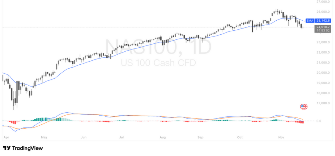 技术面上,纳指连续多日收在 EMA20(25,142) 下方,确认短线趋势由强转弱,MACD 死叉后动能持续扩大,显示卖压尚未释放完毕。目前指数在 24,300–24,500 区间企稳,但若 NVDA 财报不及预期,指数可能进一步测试 24,000 心理关口;反之如财报超预期,能否重新站回 EMA20 将是判断短线反转的关键。整体结构仍偏弱势震荡,方向将在本周财报和数据公布后正式揭晓。
