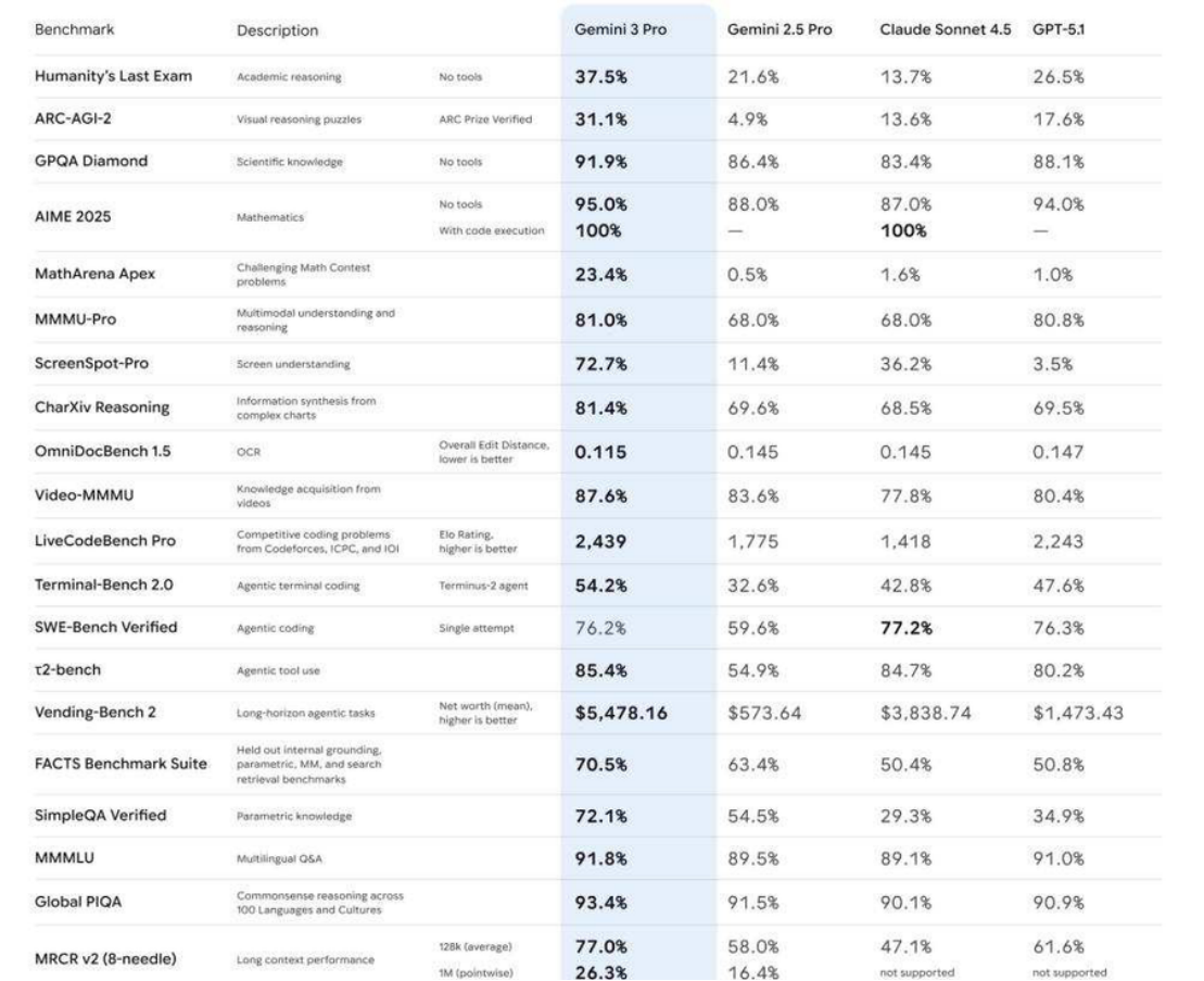 - Gemini 3 Pro 支持 100万 token 上下文窗口 + 64K 输出,在以下基准测试中显著碾压竞品: