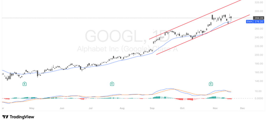GOOGL 当前稳居上升通道结构中轨附近,整体依旧维持强势多头趋势。股价多次在 EMA20(约 276 美元) 获得有效支撑,回踩后迅速被买盘推起,显示趋势买盘仍然主导。MACD 虽处于短线回落区间,但仍在零轴上方运行,属健康的动能修复而非趋势反转。