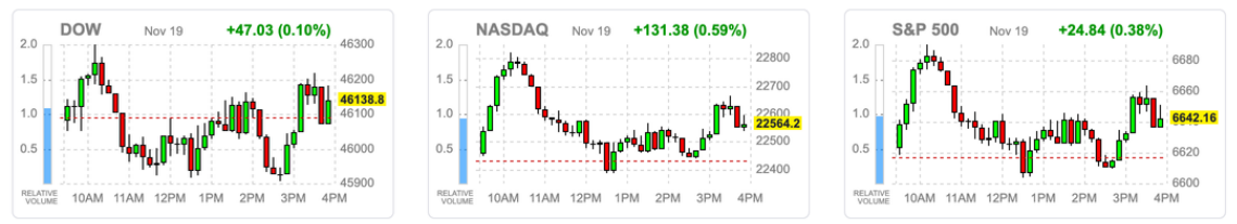 美股周三在英伟达(NVDA)财报公布前大幅震荡,开盘一度走强,但随着降息预期快速退潮、科技股波动放大,指数出现短暂回调。美国劳工统计局(BLS)宣布将 10 月就业报告并入 11 月、推迟至 12 月 16 日发布,使得美联储在 12 月会议前缺乏关键数据。联邦基金期货显示,12 月降息概率从 45% 大幅降至31%。与此同时,10 月 FOMC 会议纪要透露内部对降息方向的分歧加大,多位官员倾向暂停,也进一步压制市场风险偏好。不过,随着利空逐步被消化,盘中买盘于低位重新进场,四大指数最终反弹收高。