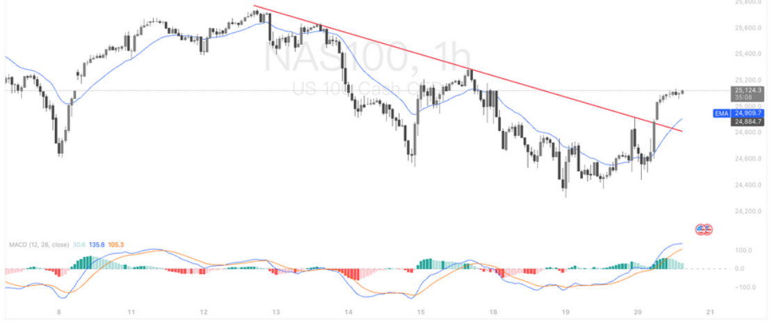 纳指在前期的连续回调后,于 19 日形成明显止跌结构,并于今日强势突破下降趋势线(红线),这是短线趋势由弱转强的关键信号。突破后价格稳稳站上 20EMA,且 EMA 已经开始上拐,显示多头主动性增强。MACD 也同步出现 零轴下的金叉 + 动能柱持续放大,典型的趋势反转形态,说明买盘开始占据优势。