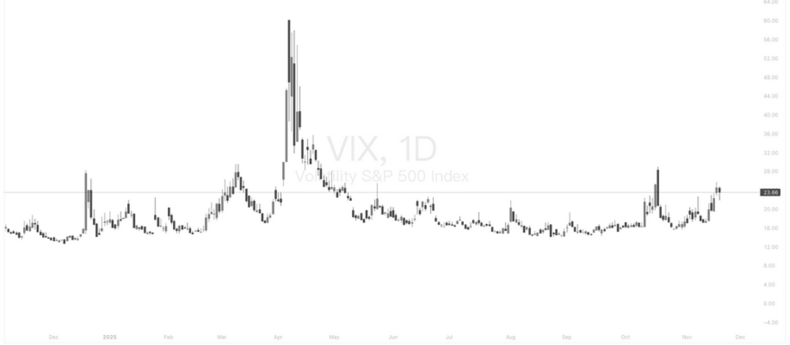 VIX 昨日下跌约 4%,从高位快速回落,显示避险情绪明显缓和,市场风险偏好短线上升。此前的连续拉升已逼近关键压力带,而这次回落意味着恐慌情绪未能进一步扩散,有利于美股指数特别是科技股的企稳反弹。若 VIX 后续继续跌破 22,一旦情绪持续降温,美股有望延续修复走势。