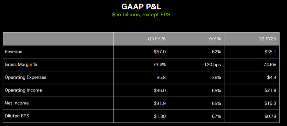 盘后焦点集中在英伟达亮眼成绩:三季度营收同比增长 62% 至 570 亿美元,全面超越市场预期,数据中心需求依然强劲;公司预估四季度营收将达到 650 亿美元,显著高于市场一致预期,缓解了近期市场对 AI 投资降温的担忧,推动盘后股价大涨逾 5%。