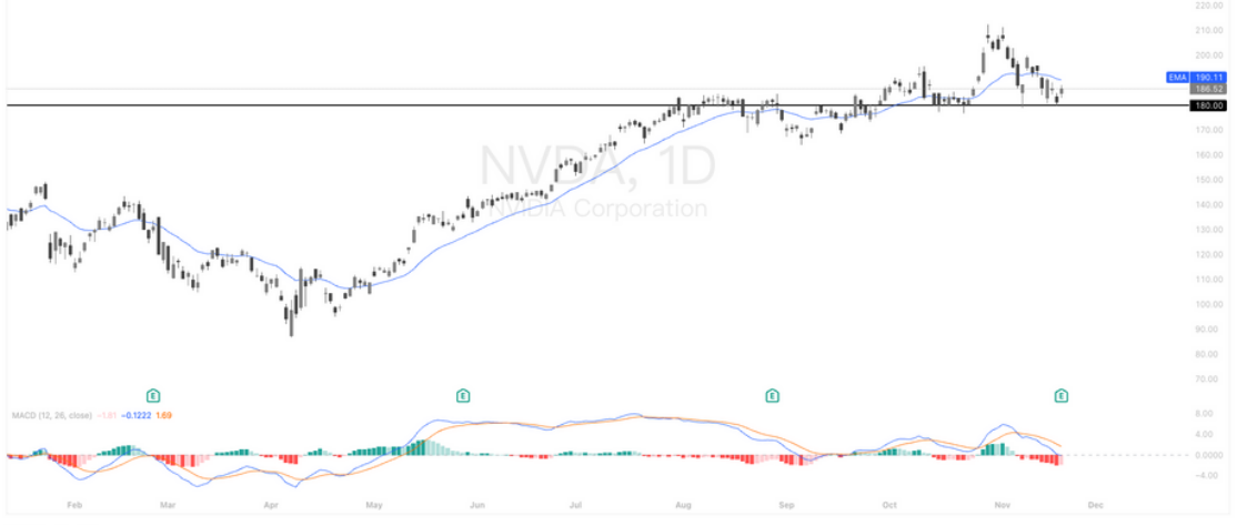 在强劲 Q3 业绩(数据中心同比 +66%,Blackwell 全线售罄、指引上调至 637–663 亿美元)推动下,Nvidia 股价在日线图成功于 180 美元关键支撑位止跌反弹,短线形成企稳形态。虽然价格仍位于 20 日均线(190 美元)下方,但近两日连续收出下影线,显示买盘在财报后明显增强。MACD 虽仍在低位,但动能柱有收敛迹象,意味着短线做空力量开始减弱。