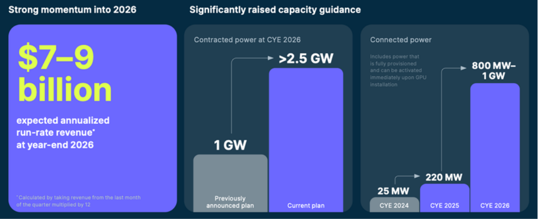 风险面:对 Nvidia 依赖度高(GPU 供应瓶颈)、行业竞争激烈、持续亏损、高资本开支导致潜在稀释(ATM 计划最高发行 2500 万股)。但考虑到 大单持续推进、产能上线即售罄、扩容效率不断提升、管线订单 Q3 环比增长 +70% 至 40 亿美元,“高增长 + 高确定性”的组合依旧成立。