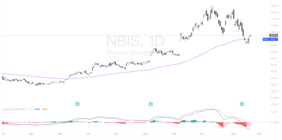 Nebius(NBIS)在本月经历约 24% 深度回调后,于 100 日 EMA(约 89 美元)获得显著支撑,昨日反弹 +5%,显示多头在结构性上升趋势中重新接手。MACD 已从极度超卖区出现初步底背离,价格成功站回 90 美元上方,短线有望进入技术性的反弹窗口。