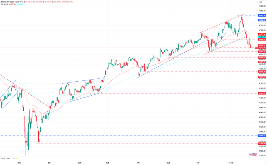 道琼指数在测试了上方的EMA50均线形成的阻力后再度回落。下跌方面,道琼指数目前的支撑为10月20日低点45729点,接着为10月14日低点45452点。上涨方面,道琼指数目前的阻力为EMA50所在的46877点,再来是48000点水平与11月12日的历史高点48431点。