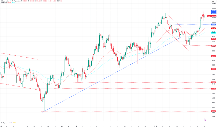 CPT Markets分析师指出,美元指数保持在100.494下方盘整,以消化RSI指针的超买讯号。上涨方面,美元指数目前的阻力为5月29日的高点100.494,再来是5月17日的高点101.234。下跌方面,美元指数目前的支撑为EMA50所在的99.748水平,接着是11月14日的低点99.023。
