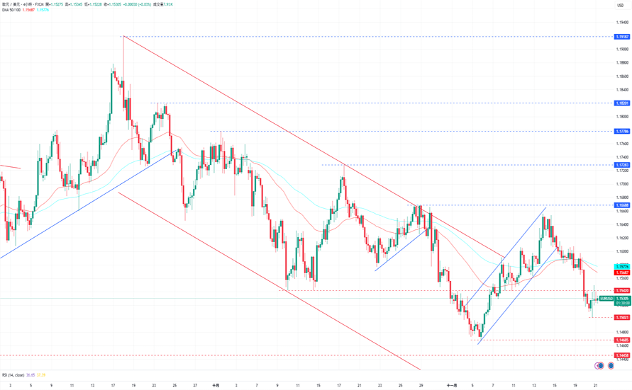 周四,欧元/美元下跌至1.15275美元。美国方面,最新公布的9月季调后非农就业人口增加11.9万人,显著高于预期的5万人,不过失业率由4.3%升至4.4%。美国至11月15日当周初请失业金人数为22万人,预期为23万人。近期美联储官员持续释放审慎讯号,包括克利夫兰联储主席哈玛克、芝加哥联储主席古尔斯比及美联储理事巴尔皆对12月降息表达不安,使降息预期进一步降温。欧元区方面,11月消费者信心初值为-14.2,与前值持平、略低于预期的-14。此外,德国10月PPI月率上升0.1%,优于市场预估的持平表现,显示价格压力略有回升。