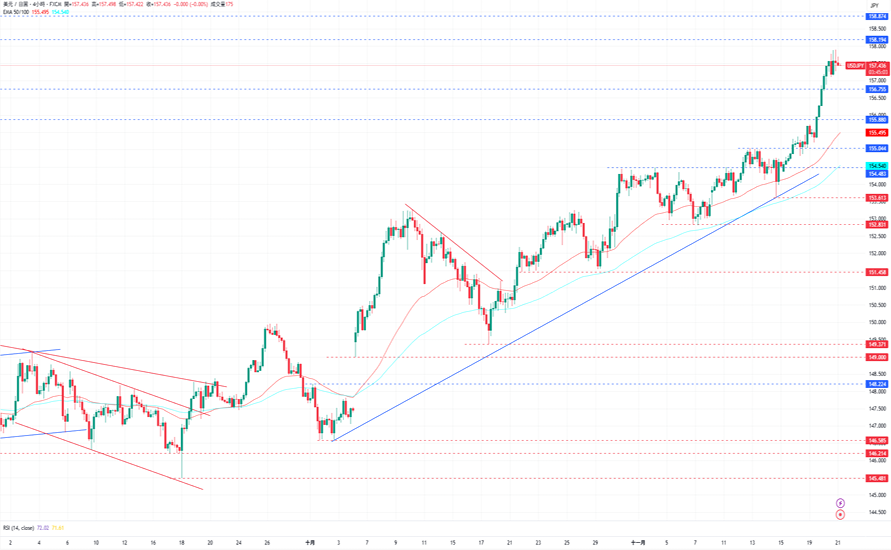 周四,美元/日元上涨至157.436日元。美国方面,最新数据显示,美国9月季调后非农就业人口增加11.9万人,超出预期的5万人,但失业率自4.3%升至4.4%。尽管失业率意外走升,市场对美联储12月维持利率不变的判断并未出现明显转变。日本方面,日本央行审议委员小枝淳子周四释出明确信号,指出可能最早于下月升息,并强调推动利率正常化的重要性,同时,日本官方对汇率波动的口头干预升温。内阁官房长官木原稔表示,近期外汇市场波动剧烈且偏向单边,政府正密切关注包括债券市场在内的整体金融情势,而此前财务大臣片山皋月也多次强调将持续密切监测市场动向。