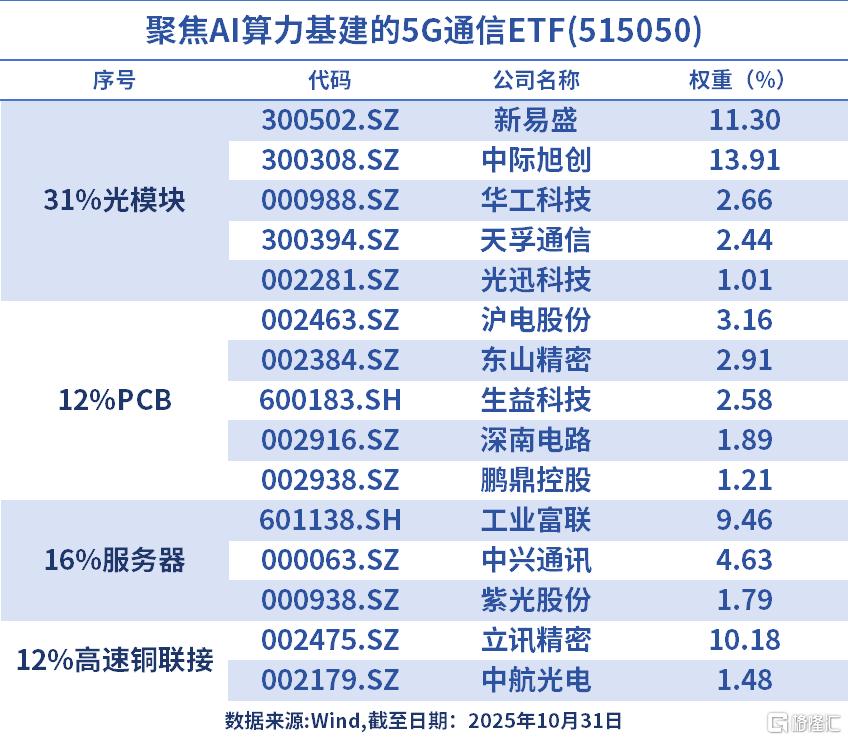 其中,5G通信ETF(515050),跟踪中证5G通信主题指数,深度聚焦5G通信(AI算力底座)产业链,涵盖31%光模块+12%PCB+16%服务器龙头+12%高速铜联接四大AI算力系统核心组件,权重股包括光模块双雄新易盛和中际旭创,也囊括工业富联等5G产业链龙头。