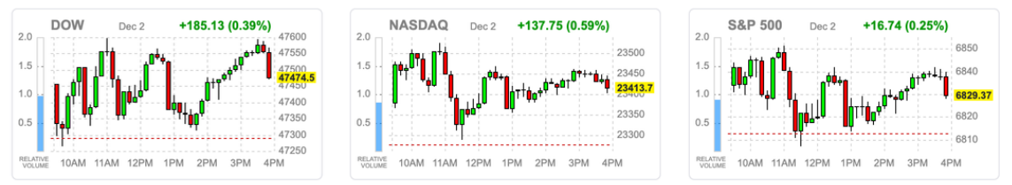 美股周二在前一日回调后小幅走高,道指+0.4%、标普+0.3%、纳指 +0.6%,三大指数距离历史高点仅剩 1–2% 空间,维持高位震荡格局。原定公布的 10 月 JOLTS 因政府关门而延后至 12/9,市场必须在 12/9–12/18 的短时间内同时消化 JOLTS、非农和 CPI,多项关键数据被压缩使市场在数据前夕更抱紧「明年降息」的框架,短线由财报与题材股主导节奏。