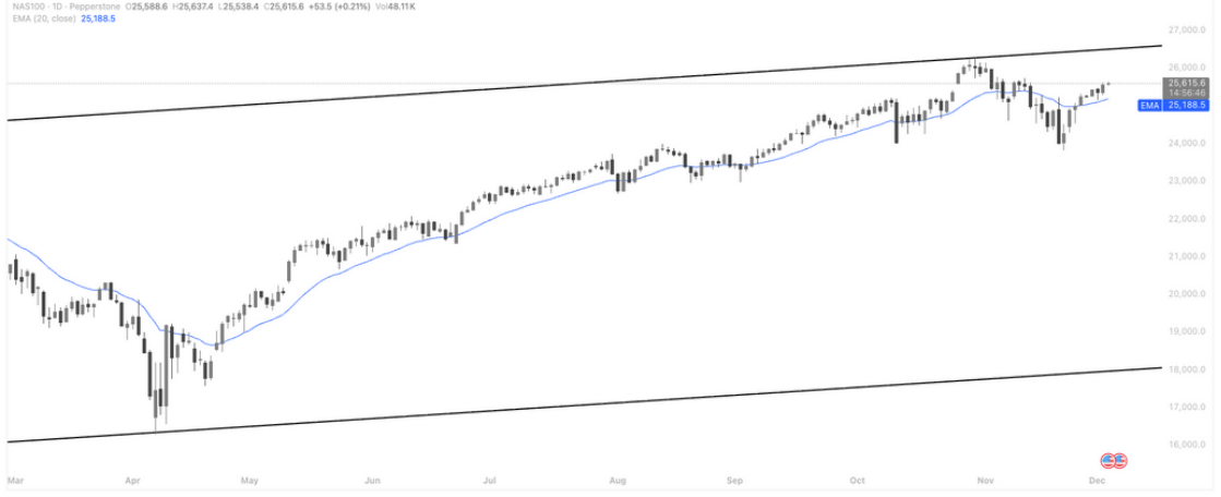 纳指100目前在日线级别维持稳健上行结构,价格重新站上 20 日均线(EMA20),并沿着均线缓步向上推进。从结构上看,指数正逼近年内上升通道的上轨区域(约 26,000–26,800 区间),属于典型的“高位震荡后再试压力”走势。只要价格持续稳站在 EMA20 之上,短线趋势仍偏多;但由于已接近通道压力,向上突破需等待下周(12/9–12/18)的密集宏观数据确认。在数据未落地前,指数大概率维持高位横盘偏强格局,节奏由 AI、云端及大型科技财报与题材股驱动。