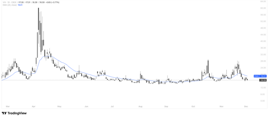 从图表看,VIX 已回到 16.5 一线,并再次跌破 20 日 EMA,市场风险情绪较为平稳。近期 11 月中旬的波动峰值未能延续,恐慌指数进入横盘偏弱结构,显示宏观风险事件的扰动正在淡化。