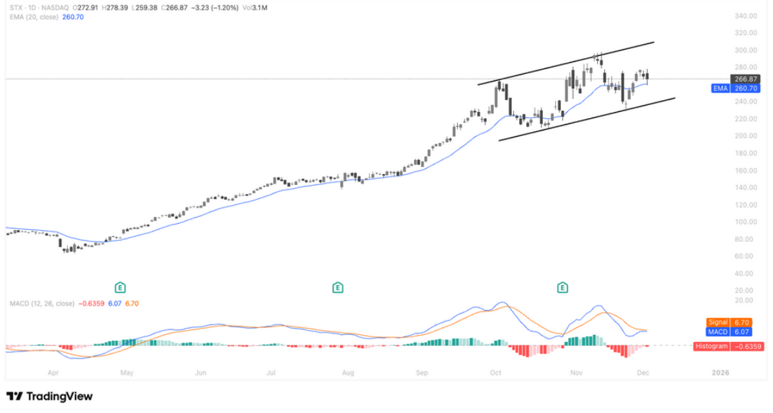 技术面显示STX正在沿着中期上升通道运行,短线完成对20日均线的有效回踩后重新站稳,显示多头结构依旧牢固;价格保持在通道中轨上方震荡整理,反映强势区间内的健康换手,而 MACD 双线低位粘合企稳,预示动能有望再度向上修复。若后市向上突破通道上沿,将打开下一轮趋势延伸空间;而通道下轨与 20 日均线构成的支撑带仍是当前趋势结构的关键防线。