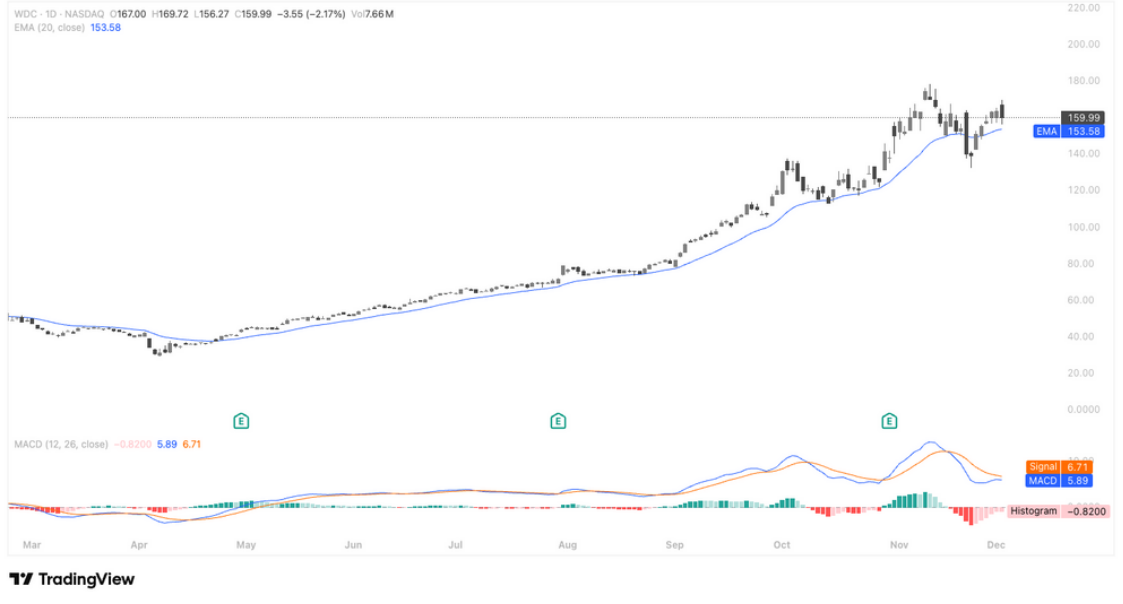 WDC 回踩 20 日均线获得支撑后重新走稳,整体结构保持在强势区间内震荡上行;近期横盘整理呈现典型的强趋势休整形态,筹码并未出现明显松动。MACD 双线在高位回落后逐步趋于粘合,显示动能正在完成从调整向再度转强的过渡。只要价格持续守在 150–155 区间上方,短线仍具备再度向前高发起冲击的条件,趋势主导权依旧掌握在多头手中。